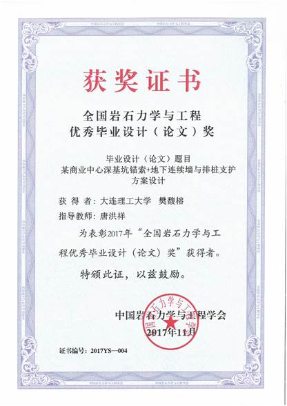 日前,由中国岩石力学与工程学会组织评审的2017年全国岩石力学与工程优秀毕业设计(论文)奖结果揭晓,其中由我学部唐洪祥老师指导,2017届樊馥榕同学的毕业设计《某商业中心深基坑锚索+地下连续墙与排桩支护方案设计》获“全国岩石力学与工程优秀毕业设计(论文)奖”。
